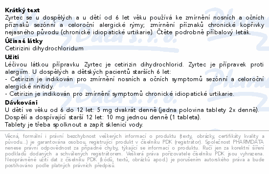Zyrtec se u dospělých a u dětí od 6 let věku používá ke zmírnění nosních a očních příznaků sezónní a celoroční alergické rýmy; zmírnění příznaků chronické kopřivky nejasného původu (chronické idiopatické urtikarie). Čtěte pozorně příbalový leták.